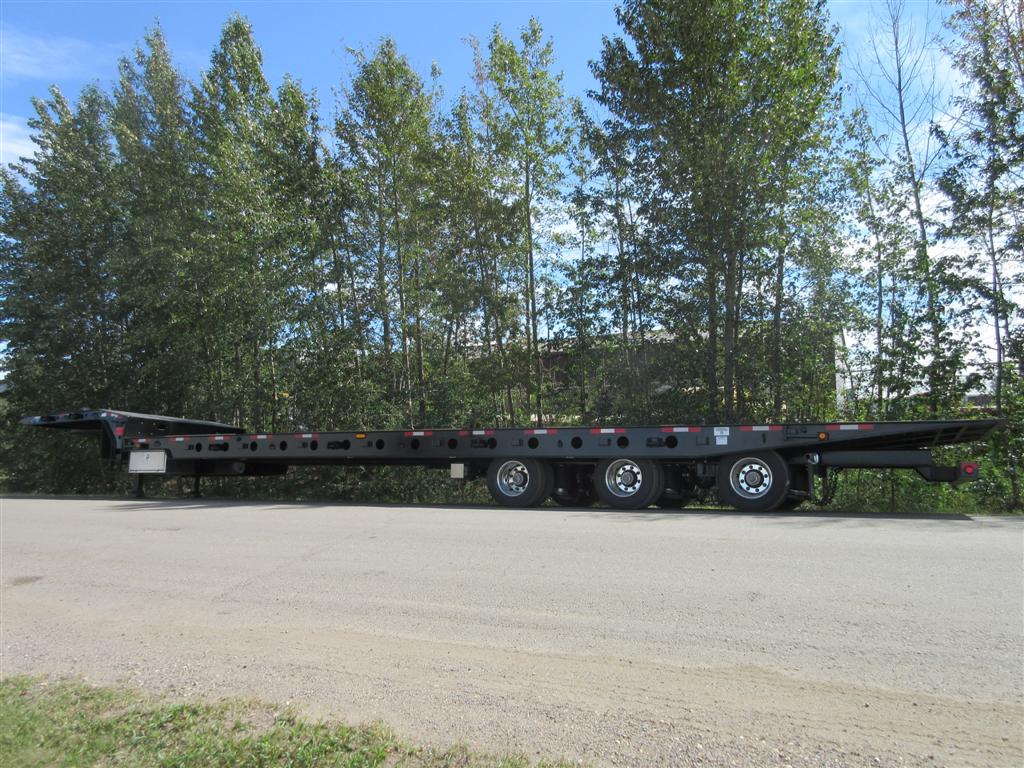Low Profile Gooseneck | 3000 lbs Worm Drive Which Mounted Above KP | LED Lights | 7 Degree Load Angle on 17.5 Rims | Strobe Lights | All Cylinders Closed in Driving Position | Sliding Axles Uses Teflon Spacer on Rails | Oscillating 5th Wheel Set Up | Various Widths Available | Hydraulic Float Valve for Loading and Unloading | Crank Legs | Wireless Remote Controlling Sliding Axle, Deck and Winch | Hydraulic Lifting Rolls | Cable/Carbines to Guide and Support Sliding Axle Lines.